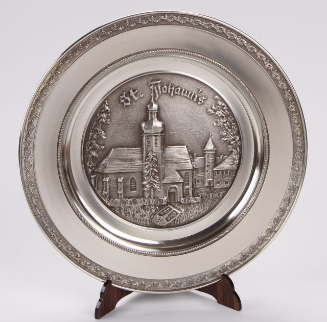 Massiv gegossener Zinnteller mit Dekorrand Durchmesser 23,5 cm Mit Öse zum Aufhängen Lieferung in Geschenkkarton Motiv St.Johannis Rödental