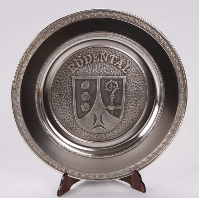 Massiv gegossener Zinnteller mit Dekorrand Durchmesser 23,5 cm Mit Öse zum Aufhängen Lieferung in Geschenkkarton Motiv Stadtwappen Rödental