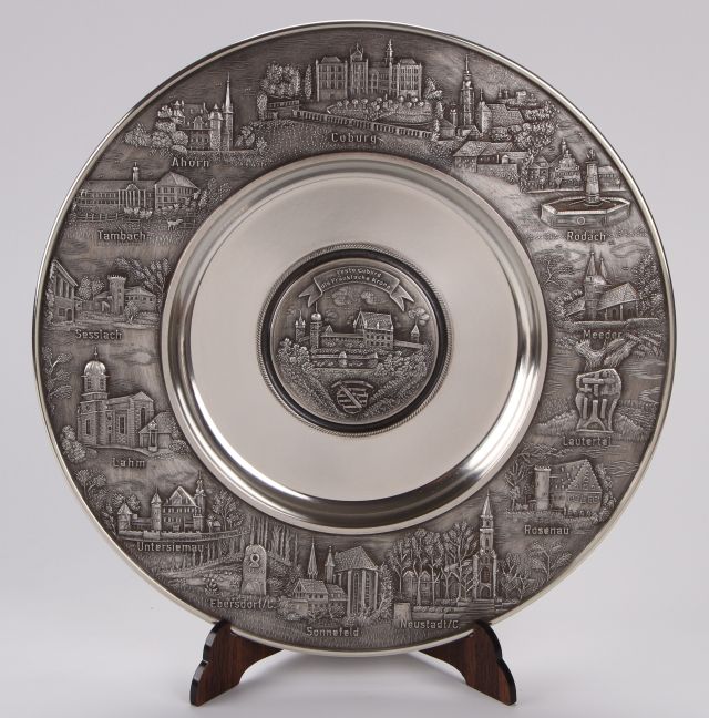 Massiv gegossener Zinnteller Durchmesser 23,5 cm Mit Öse zum Aufhängen Lieferung in Geschenkkarton Motiv