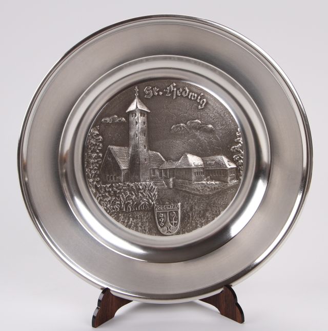 Massiv gegossener Zinnteller glatter Rand Durchmesser 23,5 cm Mit Öse zum Aufhängen Lieferung in Geschenkkarton Motive St.Hedwig Rödental